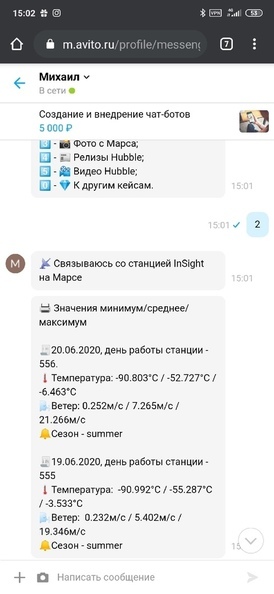 А вы знаете, сколько градусов на Марсе? и какой силы ветер дует? Занимательная функция мониторинга погоды на Марсе. Бот показывает погоду за 2 последних дня, при желании возможно увеличить до 6 последних дней и вести статистику.