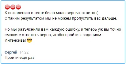 Хорошая новость в том, что каждый неверный ответ сразу подробно поясняется и пользователю остаётся лишь вдумчиво прочитать комментарий бота, чтобы ответить верно на следующем круге.