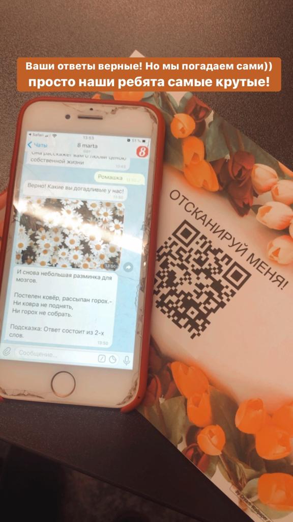 Подарки были спрятаны в заранее забронированной переговорной комнате. Девушкам накануне были вручены конверты с открытками с QR-кодом, по которому и осуществлялся вход в чат-бот-квест.
